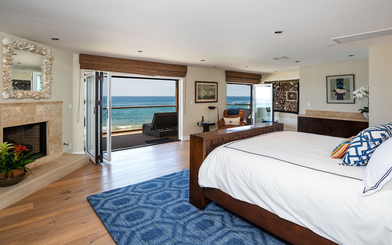 Beautiful contemporary beach house on a great sandy section of Malibu Road. Large entryway leads to the spacious two-story oceanfront living room and dining area with fireplace. Gourmet kitchen with stainless steel appliances and Viking oven and range. Floor-to-ceiling windows opening to expansive oceanfront deck with new electric awnings and direct stairs to the beach. Oceanfront master suite on own level with wide plank oak floors and fireplace, luxurious bathroom and walls of glass opening to a private oceanfront deck. Two additional bedroom suites plus a maid's or fourth bedroom with bathroom and separate entrance.