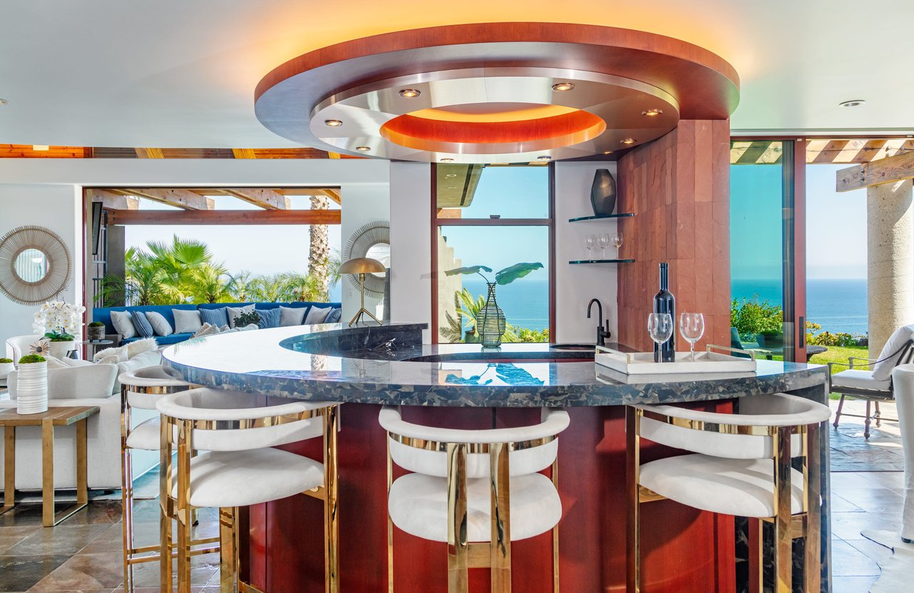 An extremely private retreat situated along the Malibu hillside, Casa Linda showcases exceptional architectural vision and panoramic ocean views stretching from Santa Monica to Point Dume. Envisioned by Marshall Lewis AIA, Casa Linda features Southwestern-inspired design, harmonizing eloquently with the surrounding natural beauty, from the earth to the sea. Meticulously crafted by hand over a ten-year period, the residence mirrors the hillside, from its undulating curvatures to its exquisite blend of materials. Airy, sun-lit living spaces fuse indoor-outdoor living, artfully framing the ocean views from nearly every room.