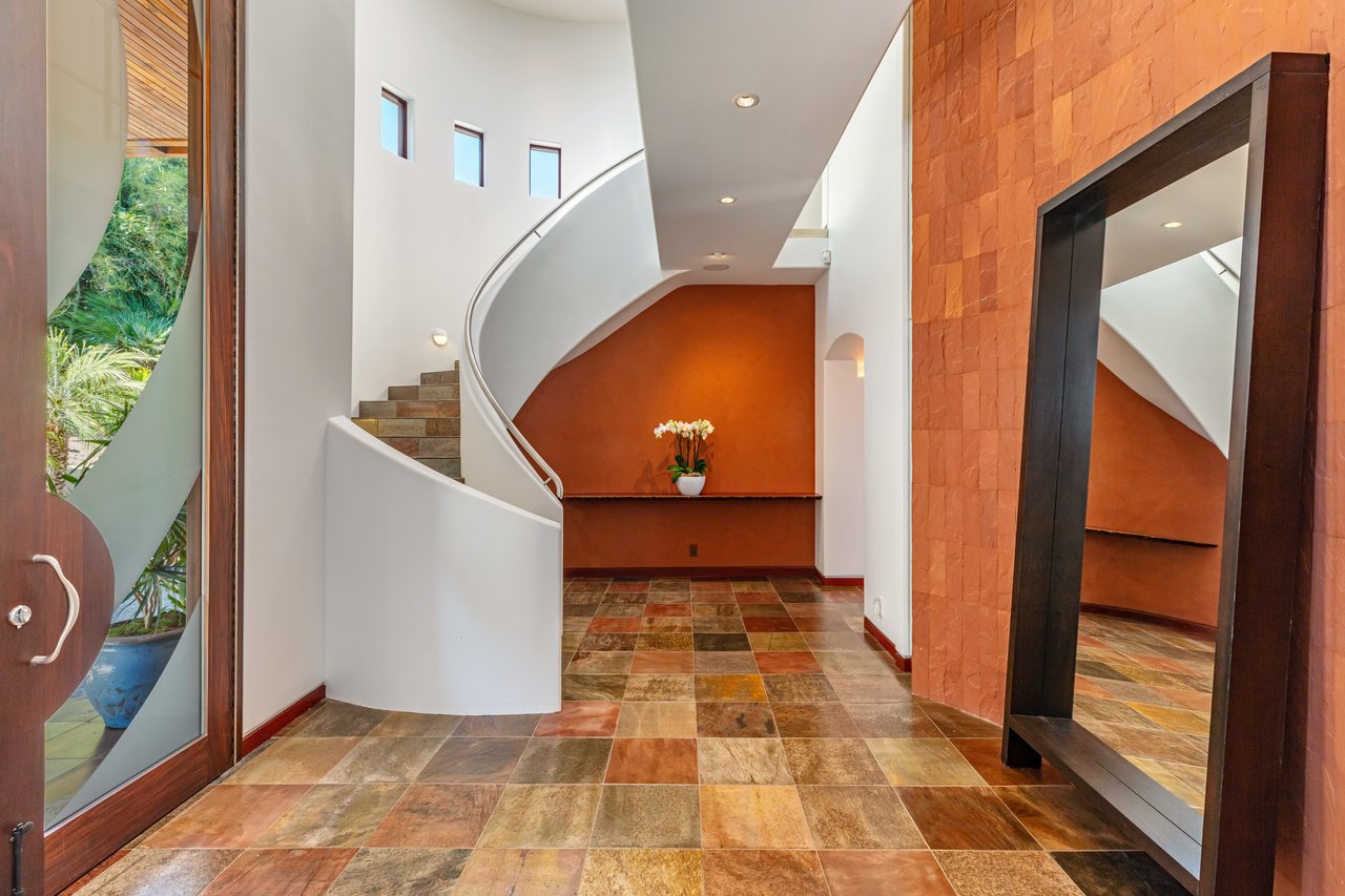 A standout architectural feature is the spectacular, skylit ribbon staircase curving to the upper level, where a glass-railed bridge crosses to the primary suite. Capturing unparalleled views of Palos Verdes and Catalina, the primary suite is nestled on its own wing, boasting an office, kitchenettes, 3 closets and dual baths with steam showers, one with a spa tub and a Pueblo Native American fireplace. Three additional ensuite bedrooms are located upstairs and one ensuite is situated on the main level.
