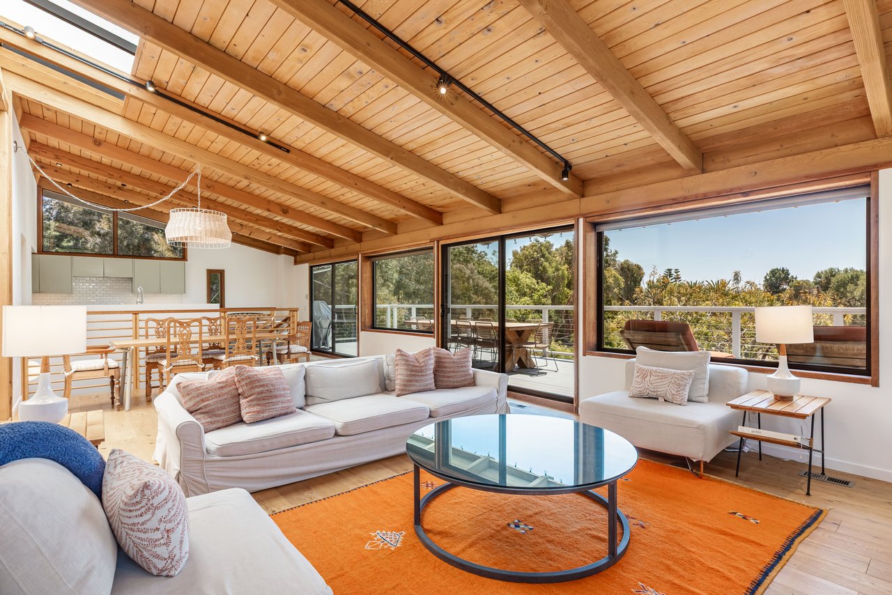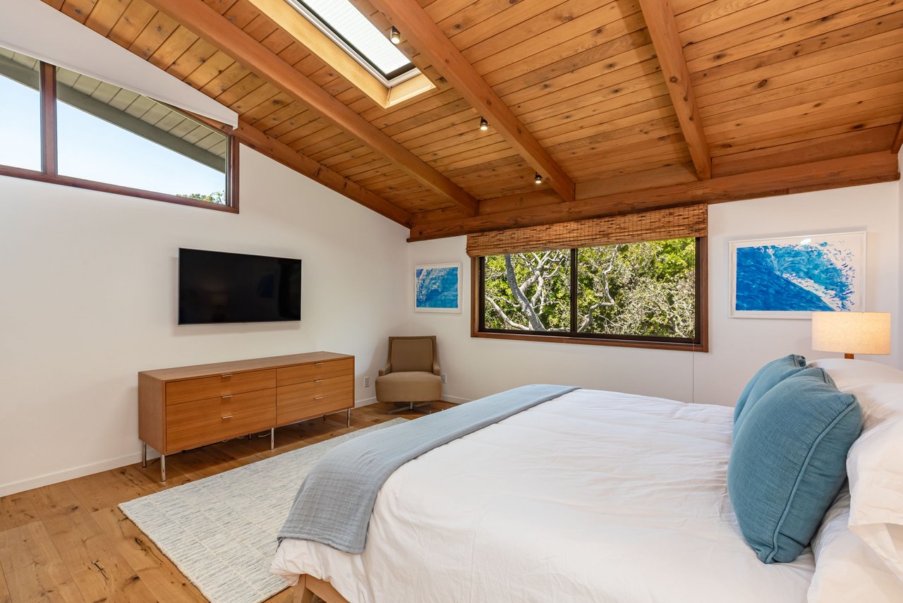 Exquisite Point Dume Architectural Retreat with Riviera 2 Beach Access. Nestled in a serene garden oasis, this stunning Point Dume home blends seamless indoor-outdoor living with sophisticated entertaining spaces. A private, landscaped driveway leads to a tranquil setting featuring a new 20x45 lap pool, heated spa, and baja shelf perfect for families or social gatherings. Relax on the sun-soaked deck or unwind in the shaded gazebo.The open-concept upper level boasts a spacious living, dining, and kitchen area at treetop height, with soaring wood ceilings, skylights, hardwood floors, and a wall of windows opening to a full-width deck. Enjoy al fresco dining, lounging, or grilling with ocean breezes. The sleek chef's kitchen shines with a 7-seat island, built-in wine storage, leather banquette, premium stainless appliances, ample cabinetry, and a flatscreen TV.The upper-level owner's suite is a haven of luxury, featuring high wood ceilings, skylights, large windows, a flatscreen, and a spa-inspired bath with dual sinks and an expansive tiled shower. Downstairs, a grand foyer with a striking wood staircase connects three garden-view bedrooms, two baths, and a laundry room.Outside, stone paths weave through exquisitely landscaped grounds, linking front and back yards with inviting spaces for strolling or gathering. A detached two-car garage, outdoor shower, and ample guest parking add convenience. This Malibu sanctuary offers every comfort of coastal living, steps from Riviera 2 beach access to Little Dume Beach.Available for short-term lease; contact for rates and availability.