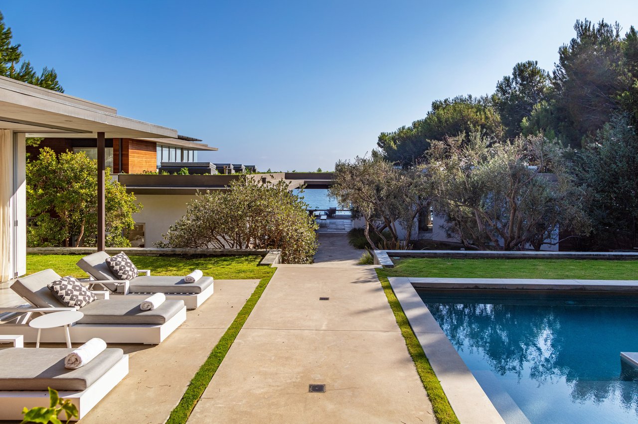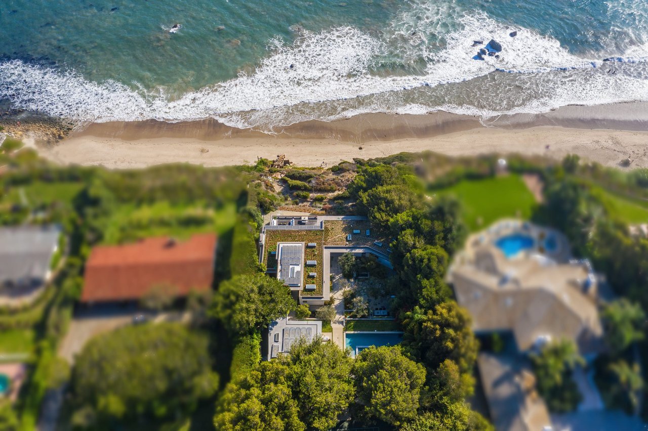 Situated in Malibu’s ultra-private Encinal Bluffs enclave, this stunning, sustainable estate on 1.9 blufftop acres offers panoramic ocean views and direct beach access. In 2009, W3 Architects stripped the original house down to the foundation and spectacularly reimagined and expanded the estate to fuse indoor-outdoor living while maximizing energy efficiency and far-reaching vistas. Surrounded by tall leafy trees and swaying palms, the main residence features light, bright interiors with soaring ceilings and gallery walls. The chef’s kitchen, living and dining rooms open through broad, floor-to-ceiling pocket doors to an expansive blufftop terrace, ideal for entertaining amidst the ocean views. Four en suite bedrooms in the main house, inclusive of the secreted master suite with terrace access and ocean views. A second-story, glass-walled loft sits atop the main residence overlooking the 3,000-square-foot planted “living roof”. The guest house, which presides above the pool, boasts a spacious living area with a kitchenette plus a separate bedroom and a full bath. Each of the living spaces look out upon and open to the endless, lushly planted grounds, which feature a solar-heated pool and spa, multiple dining areas, fireplace, sports court, organic vegetable garden and stone paths lined by mature trees. The passive solar home features large expanses of south-facing glaze, allowing for direct solar gains. A photovoltaic array provides for all the home’s power needs, while a separate active solar thermal water heating system provides the hot water needed for the home, the in-floor hydronic radiant heating system, and the pool and spa. Sustainably sourced materials include FSC Certified Western Red Cedar siding, engineered lumber and plywood, zero formaldehyde cabinetry, low or zero VOC finishes and natural plaster throughout. With parking for 25 cars and steps leading directly to the sand and sea, this Zen-inspired, entertainer’s retreat offers absolute privacy, minutes from Malibu’s world-class dining, shopping and schools.